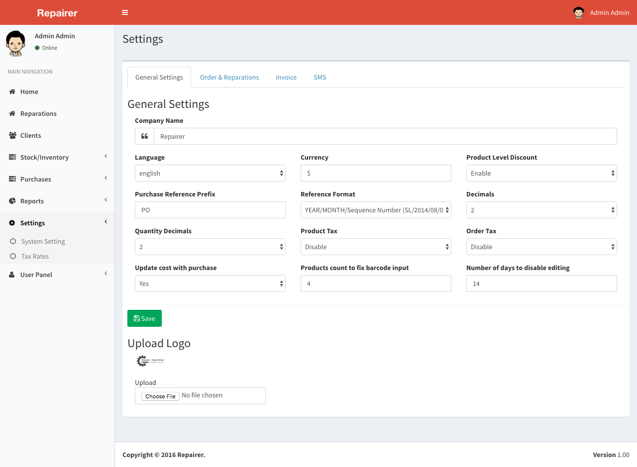 - This is the place where you can change repairshop information, sms & email, logo, currency, invoice info etc.